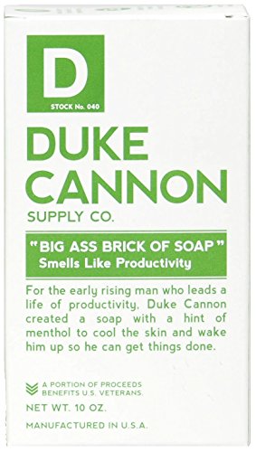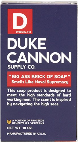 Duke Cannon "Big Ass Brick of Soap" Smells Like Victory: The Big Ass Brick of Soap is designed to meet the high standards of hard working men who want to get clean and smell good without using feminine shower gels and accessories. True to its name, our soap is big (10 oz.) and will last much longer than the chick-sized bars in your local grocery. It also smells awesome (clean, fresh scent with a hint of grass) and contains steel cut grains for maximum gripability. If you enjoy activities like drinking American beer or using power tools, then frankly, this is the only soap meant for you. This soap product is designed to meet the high standards of hard working men who want to get clean & smell good without using feminine shower gels and accessories. This product is modeled after the rough cut, "brick" style of soap used by GIs during the Korean War and is manufactured in the same plant that was the primary supplier of military soap for over 20 years. ** Note - This listing is for the GREEN Smells Like Victory bar soap ** In appreciation of the men and women who have kicked ass serving our country, Duke Cannon Supply Company donates a portion of proceeds to veterans causes. MADE IN THE USAFeature