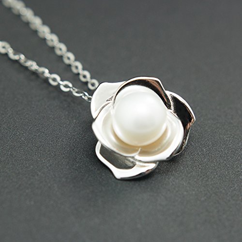 3, [Design] Rose pendant shaped by 925 sterling silver,freshwater pearl gentle and beautiful, delicate and exquisite.Perfect combination of the pearl and white-gold plated silver luster gives you a peculiar visual feast and endows a charming imagination and innovation to this elegant jewelry.Sterling silver pearl nacklace as a gift everyone will enjoy.Suitable any color of clothes, any style and attendance at different occasion.