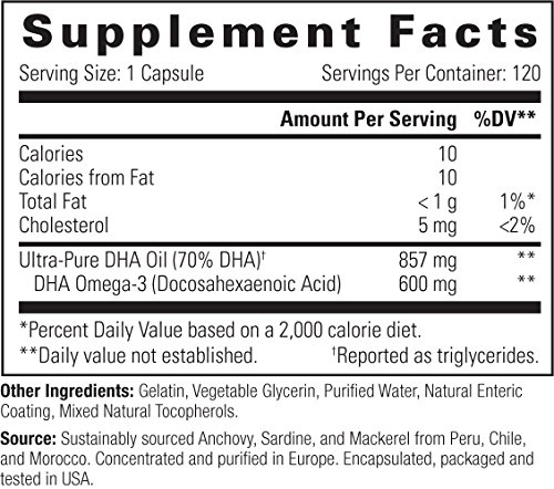 OmegaVia DHA 600. Ultra-Pure DHA Omega-3. 600 mg DHA per pill. Triglyceride-form DHA-only formula. 120 Capsules.
