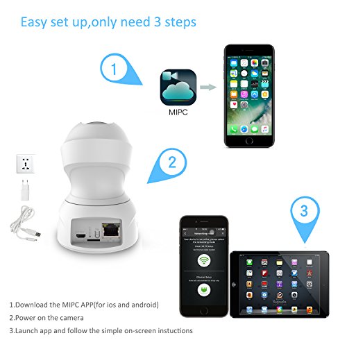 -. Feature : 【EASY SETTING】: Scan QR Code to download MIPC View App on App Store or Google Play. Seamlessly HD video streaming and two-way audio via your smartphone, tablet, Mac and PC. Wired power outlet required. Supports Ethernet cable connection with router. The MIPC view App will keep updating to add more features. / 【HIFI AUDIO FUNCTION】: Using unique audio intercom chips and via 3D voice engine, echo cancellation and noise suppression technology to enhance voice quality, it is unparalleled in its intercom and audio function. / 【TWO-WAY AUDIO】: Built-in speaker and microphone, not only can you see what is happening in front of your camera, also you can hear and speak. Tell your dog to get off the couch or tell intruders that the police are on the way. / 【BROAD FIELD OF VIEW】: Remote Pan/Tilt via your phone or tablet computer (Horizontal:350°& Vertical:100°), Intelligent 8x Digital Zoom, Intelligent Motion Alerts and built-in IR array infrared led lights, view up to 10 meters in total darkness under night vision mode, Support remote view and control via phone/tablet/pc. / 【EXCELLENT FULL HD VIDEO】: Stunning HD Video Quality 1280 x 720p 30 fps Face to Face effect, High resolution live streaming delivers you a crystal clear picture with more details to know what's going on when you're away from home.Support record and playback with local micro SD card(up to 64G), Cloud Box(Not included).