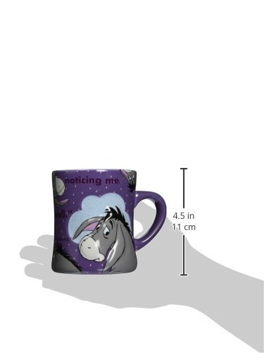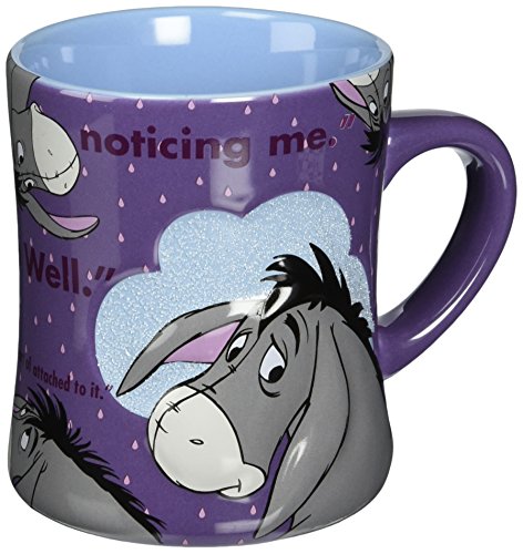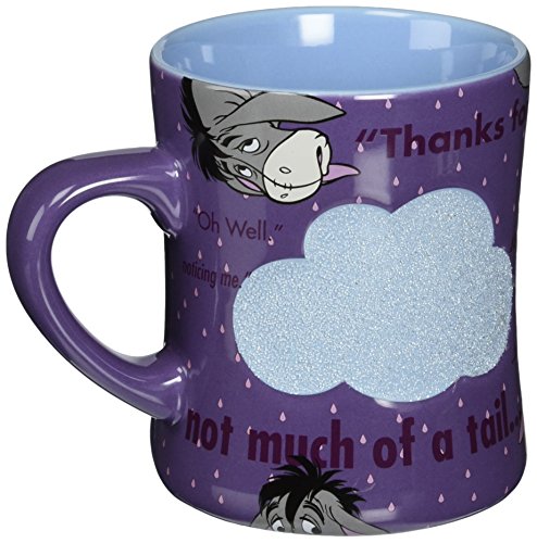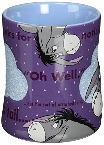 -. Brand : Disney -. Color : purple -. EAN : 0726528296311 -. Feature : Disney Parks Exclusive / Eeyore's Popular Slogans art / "Thanks for noticing me" / "It's not much of a tail... ... but I'm sort of attached to it." "Oh Well." / Ceramic - 5'' H - Holds 16 oz. -. Label : Disney Theme Park Merchandise -. Manufacturer : Disney Theme Park Merchandise -. PackageQuantity : 1 -. ProductGroup : Kitchen -. ProductTypeName : KITCHEN -. Publisher : Disney Theme Park Merchandise -. Size : 16 ounce -. Studio : Disney Theme Park Merchandise -. Title : Disney Eeyore Pretty Purple Mug -. UPC : 726528296311