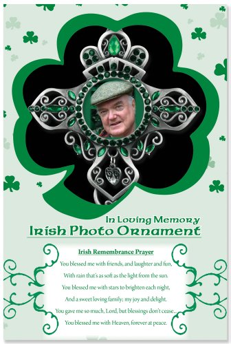 -. Feature : Brushed-metal ornament with Celtic cross and / Irish Remembrance Prayer: You blessed me with friends, and laughter and fun, With rain that's as soft as the light from the sun. You blessed me with stars brighten each night, And a sweet loving family, my joy and delight. You gave me so much, Lord, but blessings don't cease..... You blessed me with Heaven Forever at peace. / Displays a 1 3/8" photo / Includes ribbon for hanging and accented with crystals / Gift boxed and measures 4.25" x 3.5"