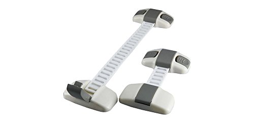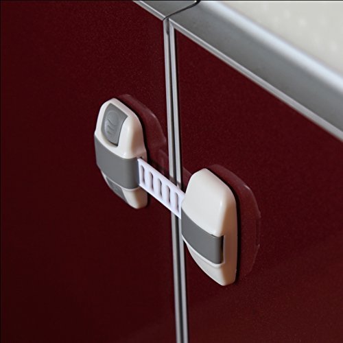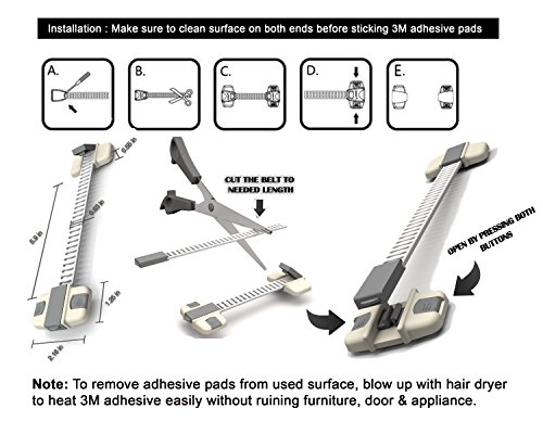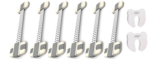 - Feature : One set contains 6 pcs versatile babyproofing & child proofing multi-purpose keyless safety latches and 2 pcs foam door guards. Safety latches are used as cabinet locks, drawers or drawer locks, cupboards locks, fridge locks, toilet seat locks, sliding window lock to prevent your babies and toddlers from getting into their hands sharp objects, medicine poisonous chemicals or small things that they might swallow out of curiosity. / This child safety locks are made of high grade strong plastic flexible materials straps that can resist force and won't break and the 3M adhesive pads are proven firm to stick well on clean even surface but can be easily removed when you won't need the locks by simply blowing heat on the adhesive pads with a dry blower without leaving a colored or dirty spots. / Make your home and baby safe with less time and effort. No drilling required. Clean the surface on both ends where you intend to put the 3M adhesive sticker pads, wipe it with a dry cloth and stick it on the surface. Cut the adjustable strap or belt using scissors to the needed length and desired tightness that will prevent your baby, child, and toddlers from opening. Open the gray portion and insert the strap or belt and close it. / The 2 pcs. door stopper, door guards or baby finger pinch guard are made of PE foam material - safe non-toxic, highly flexible, durable, designed for longer service life, and will not damaged wooden doors, no drilling of holes involved. Just slide them easily to the edge of doors, on an area away from the reach of your baby, child and toddler. Can be used for doors and windows to prevent injury and accidents to baby, toddler or children from fingers' pinches or smashed fingers by sliding door lock, window door lock or any doors closing suddenly. Also prevents doors from sudden closing so you can check your kids activity while in another room. / 100% Money back Guarantee if you are not satisfied with our product!