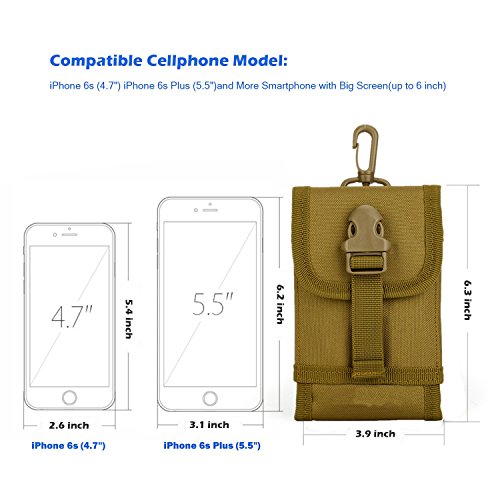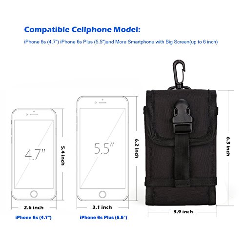 -. Feature : Made of red 1000D High-density waterproof nylon fabric + Elastic strengthen buckle + Refined plastic hook, Lightweight and durable. / MOLLE & Hook design, easily connect to various MOLLE-compatible backpack pouch, belt and vest. / Approx Dimension: The Large Size :6.3" X 3.9" X 1.2" (L x W x T); The Small Size: 5.5" X 3.0" X 1.0" (L x W x T), both with front latch for adjustable height. / Excellent to hold smartphone with big screen. The large one fit iPhone 6s Plus (5.5'') itself perfectly, with an otter box defender case would fit so tightly, a slim case is fine. The small one fit iPhone 5/5s/4/4S/SE or similar size accessory. Please compare your device size to weigh before order. / Simple convenience, Sold and Quality Guaranteed by Registered Trademark DYJ Only.