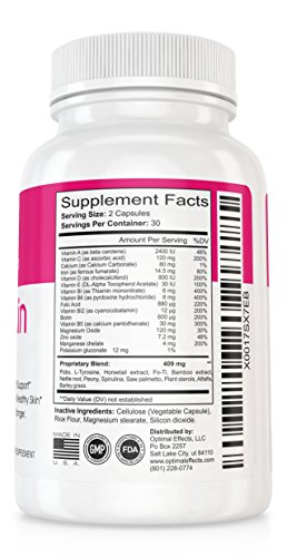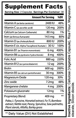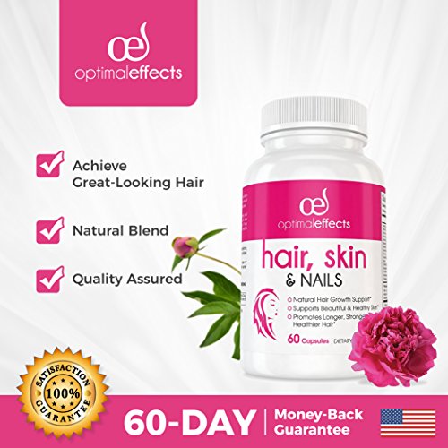 NATURAL BLEND: the Optimal Effects hair growth support formula has been expertly developed to help create longer, healthier hair while giving you a glowing complexion and longer nails. Each capsule features a harmonious blend of Biotin, Calcium, Iron, Vitamin B6, Folic acid, Vitamin B12, Magnesium Oxide, Potassium Gluconate, Paba, L-Tyrosine, Bamboo Extract, Nettle Root, Spirulina, Saw Palmetto, Alfalfa and more.