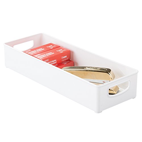 -. Title : mDesign Office Supplies Desk Cabinet Organizer Bin for Pens, Pencils, Markers, Highlighters, Tape - 16" Long x 3" High, White