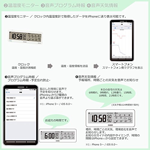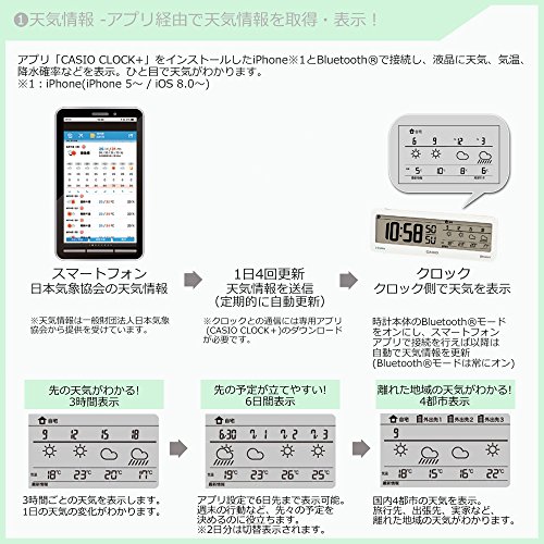 ◆Bluetooth기능에 의해 일본 기상 협회의 날씨 정보를 어플리케이션 경유로 iPhone부터 취득.날씨 정보를 표시 음성 안내하는 두어 형clock입니다.◆크기:높이93mm×폭262mm×(길이)깊이59mm◆Bluetooth기능 ◆일기예보 표시 ◆음성 가이드 기능 ◆전파 수정 기능 ◆듀얼 타임 ◆생활환경 통지 기능 / ※대응하는 단말 에 대해서 메이커 사이트를 확인해 주세요.※모바일 링크 기능을 사용하려면,전용 어플리케이션「CASIOWATCH+」를 휴대폰으로 다운로드 할 필요가 있습니다.※모바일 링크 기능에 관하여는,휴대폰 본체의 사양 및 사용하는 나라의 통신 업자의 서비스에 의존 하는 것이고, 개개에 다릅니다.