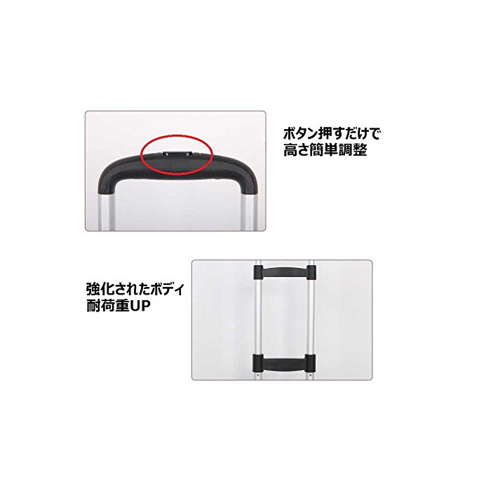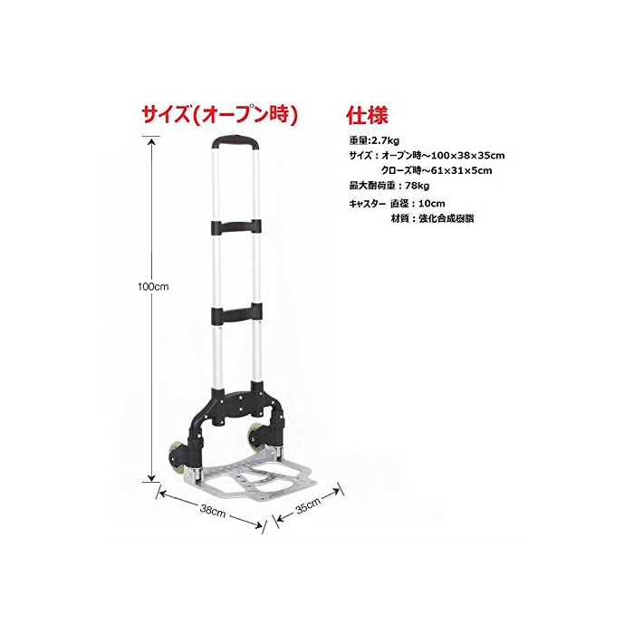 특징:①경량 콤팩트 사이즈.운반도 수납도 간단②강화 된 바디,와이드인 토대부.대키이나 무거운 짐 운반하는 데도 대응(최대내 하중78Kg)③3단계에서 높이 조절가(잡아끄는 경우 만).소병로부터 장신의 분(쪽,편)까지 폭넓게 대응
