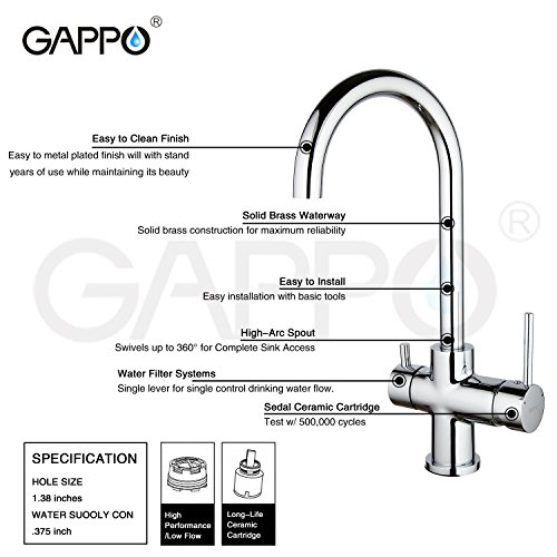 GAPPO Elegant 3 Way Hot and Cold Kitchen Faucet for Reverse Osmosis Systems, Polished Chrome