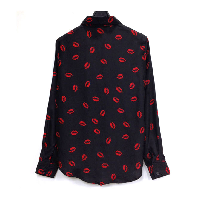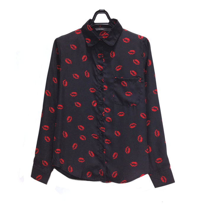 Women Lips Painted Lapel Long Sleeve Chiffon Shirt Tops Blouse T-shirt