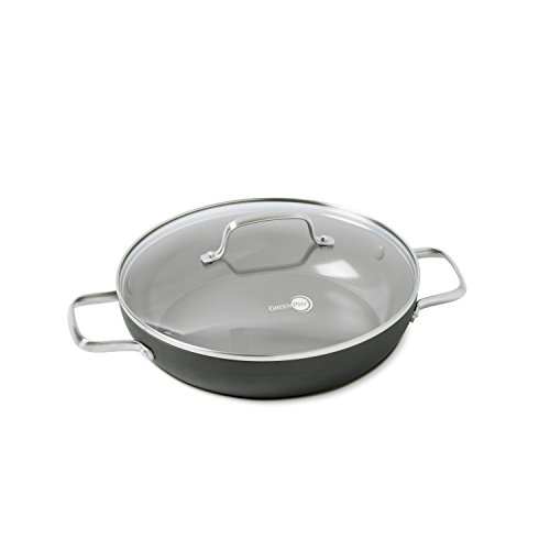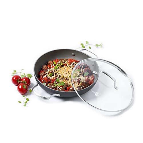 The Chatham 11" ceramic non-stick covered everyday pan with 2 helpers encompasses all of the very best GreenPan features in one flawlessly designed Product. Constructed with durable, hard anodized bodies for maximum strength and scratch protection, Chatham's interior is complete with Thermolon healthy ceramic non-stick, now upgraded to be metal utensil safe! Thermolon achieves cooking perfection with less oil and is easy to clean, but for your convenience is dishwasher safe. Manufactured without pfas and PFOA, Thermolon is lead and cadmium free, extremely chip resistant and offers great cooking results with crispy frying and even browning. Drip-free edges allow for easy pouring with less mess and durable, contoured, oven safe stainless steel handles give you a secure grip. Select pieces are covered with glass lids for easy food monitoring without losing the heat, helping you keep an eye on your meals. Oven safe and broiler safe (glass lids up to 428 DegreeF), GreenPan Chatham creates your perfect kitchen.Feature