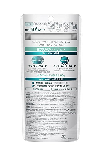 This creamy gel sunscreen is made by Kanebo Cosmetics, one of Japan leading cosmetics manufacturers. Using their skills they have produced Allie range of products. This Extra UV Gel replaced the popular Mineral Moist NEO sunscreen in 2018 and is the flagship product in the range and is great for outdoor summer use! New version includes 'Friction Proof' technology to help ensure the sunscreen continues to protect even after being rubbed. Results in increased water resistance and retains it's power even after sweating. Contains Kanebo's original Advan technology to give deep UV barrier protection whilst being light and comfortable to use. Includes hyaluronic acid and collagen to moisturize skin. Free from fragrances, parabens and mineral oils. Strong SPF50+ PA++++ power but comfortable for everyday use on face and body. Large 90g tube. Size: 90gFeature