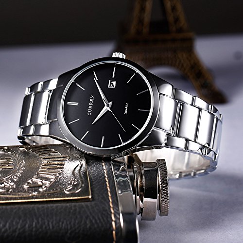 -. Feature : Simple Casual design watch,packed with clothing cloth and steel strap adjuster,you can adjust length to fit wrist by yourself / Silver stainless steel watch band and steel case with fold over clasp / Quartz movement with analog display with simple black dial,easy to read / Round watch with featuring hour marks and auto date / Water resistant up to 30M (Suitable for daily use. Splash/rain resistant.NOT suitable for diving, swimming, snorkeling, water-related work)