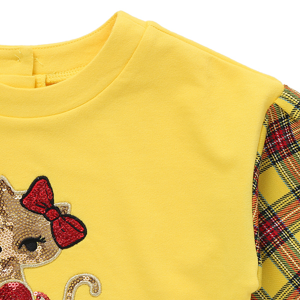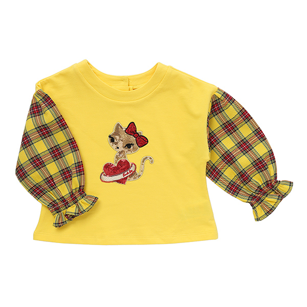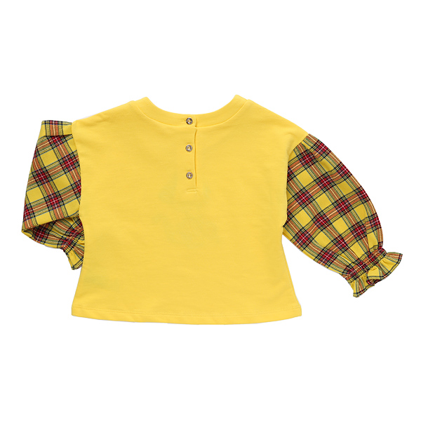 상품설명 소매가 옐로우 타탄 체크가 배색이 되어있는 탑 입니다. 소매에 밴딩과 함께 프릴셔링이 잡혀있어 러블리함을 더했습니다. 데님 팬츠 또는 옐로우 체크치랭스와 코디하시면 셋트로 입히실수 있습니다.