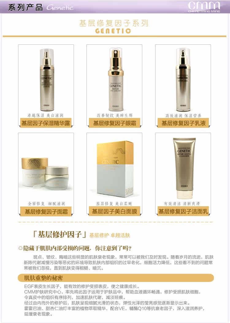 【产品名称】郑明明 基层修护因子霜50g[滋润型]新包装 【产品规格】50g 【品 牌】CMM 【产 地】上海 【塑 封】无 【保 质 期】3年 【产品特点】 1、有效激活细胞的增殖和分化,去除老化死去的角质层细胞,特别修护受损和趋于老化的肌肤,使面部肌肤恢复紧致与弹性; 2、促进基地细胞的持续及健康分裂 加速皮下毛细血管的微环,使肤色自然红润; 3、辅以保湿因子来改善干燥缺水现象和促进皮肤血液微循环,细胞再生和新陈代谢以及使面部肌肤恢复紧致与弹性,平复斑疤,恢复肌肤平滑的活性成份。 【主要成分】 1、EGF:多肽类表皮生长因子 2、透明质酸:保湿抗氧化,消除活性氧 3、核酸:取至DNA鱼类的精巢和RNA酵母,修复DNA 消除活性氧保湿 【使用方法】 1、早晚于面霜步骤,取本品适量; 2、用五点法涂抹于脸部和颈部,避开眼周肌肤; 3、轻轻涂抹均匀 自下而上轻轻按摩至吸收即可。 【适用肌肤】任何肤质 尤其适合偏干面部肌肤松弛者使用 敏感肤质慎用 【储存说条件】用后盖紧 阴凉处保存