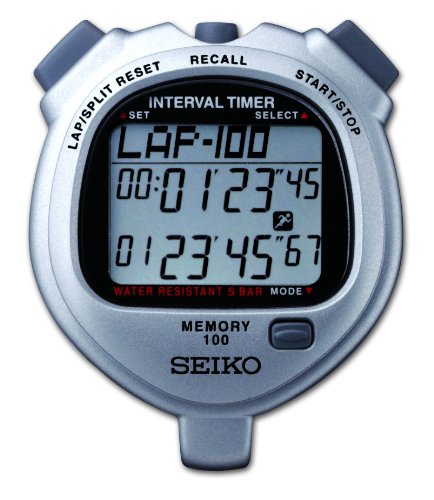 100 Lap Memory with Dual Timers! Interval timer function can be set to have both countdown with auto repeat and different alarm tones. Can be set from 10 seconds to 99 hours, 59 minutes, 59 seconds. Timers can auto repeat cycles from 1 to 100 or indefinitely. Memory recall and countdown can be used during stopwatch operation. On/off confirmation sound, battery life indicator, automatic shut-off function and 5-bar water resistant.