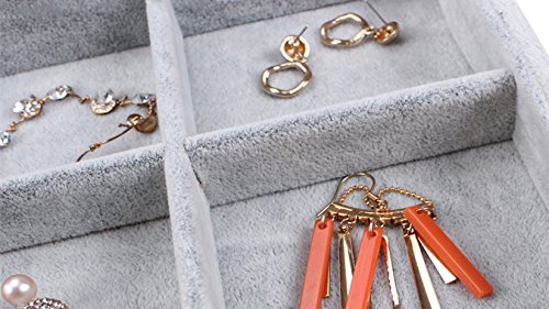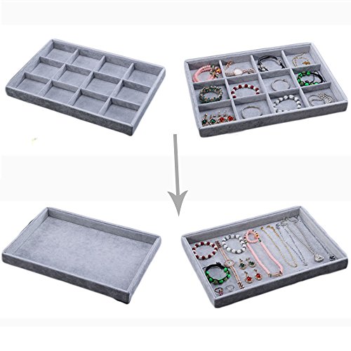 -. Feature : The multifunctional jewelry tray can be used to store earrings, necklace, bracelet, rings, watch,cufflinks and more / Features 8 removable dividers to separate the jewelry tray into 24 equal sectional compartments. The compartment size and compartment number can be adjusted by removing or adding the divider to suite your storage needs / Stackable design: The jewelry tray can be stacked on your drawer or dresser to save space and to accommodate your growing collection / Perfect for personal use at dressing table or business use in a retail shop etc / Size : 13.78" x 9.45" x 1.18"/35 x 24 x 3cm; Lattice (12 compartments):1.97" x 1.97"/ 5 x 5cm