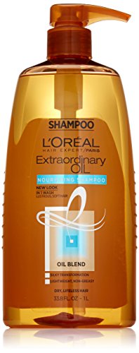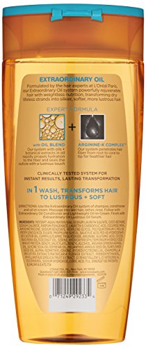 L'Oreal Paris Extraordinary Oil Shampoo hydrates and nourishes to transform dry, lifeless hair to soft and lustrous in just one wash with our Expert Extraordinary hair oil system. Hair is sumptuously soft, lightweight, and brilliantly shiny. For best results, use L'Oreal Paris Extraordinary Oil shampoo and conditioner together. • Shampoo for dry, lifeless hair • Eliminates dryness in just 1 wash based on when you use the complete system of shampoo, conditioner, and treatment vs a non-conditioning shampoo • With Luscious, Lightweight Oils • Deep nourishment without the weight *When using full system of shampoo, conditioner, and treatment vs. a non-conditioning shampoo. Packaging may vary, what you receive may not be what is reflected on site.Feature