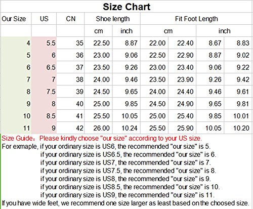 Size Information US size 5 B(M)=22.5-22.9cm =8.87-9.02inch(Foot Length) ; US size 6 B(M)==23-23.4cm =9.06-9.22inch(Foot Length); US size 7 B(M)=23.5-23.9cm =9.26-9.42inch(Foot Length); US size 8 B(M)=24-24.4cm =9.46-9.61inch(Foot Length); US size 9 B(M)=24.5-24.9cm =9.65-9.81inch(Foot Length); US size 10 B(M)=25-25.4cm =9.85-10.01inch(Foot Length); US size 11 B(M)=25.5-25.9cm =10.05-10.20inch(Foot Length);