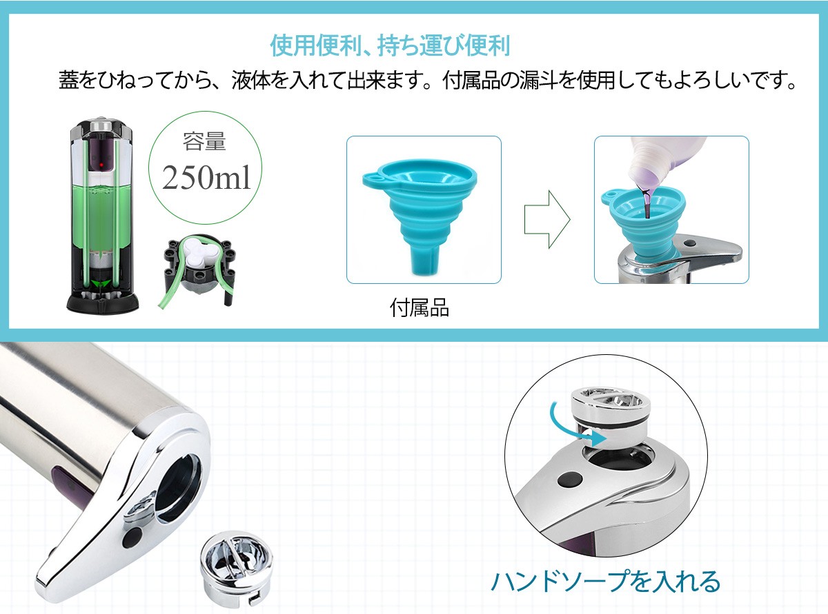※入れる液体はソープディスペンサーの本体容量を超えらないようにしでください、液体漏れないように、本体を傾けないでください。