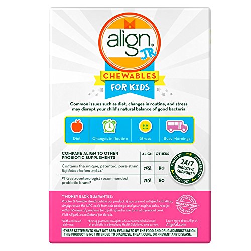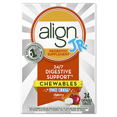 Help support their digestive system, so they can be kids again. Align Jr. is a daily dietary supplement in chewables that fortifies your child's digestive system with healthy bacteria 24/7.* Now with a tasty Cherry Smoothie flavor, Align Jr. comes in an easy-to-take chewable tablet with no artificial sweeteners or colors. Align Jr. is the only kids probiotic that contains unique, patented probiotic strain Bifidobacterium 35624TM. With continued daily use, Align Jr. can help fortify your kids' digestive system.* Chances are, you've considered several approaches to help support the digestive health of your child, from diet to routine to lifestyle changes. Consider adding the simplicity and convenience of Align Jr.Feature