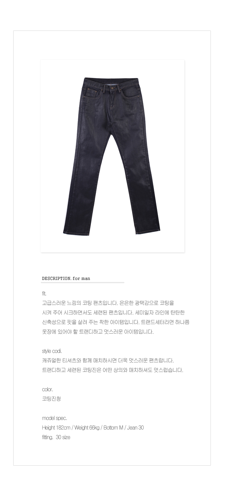 트랜디하고 세련된 코팅진은 어떤 상의와 매치하셔도 멋스럽습니다.