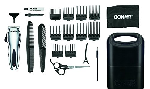 Includes styling clip, barber comb, styling comb, barber scissors, barber cape, cleaning brush, lubricating oil, blade guard, AC-DC adapter, and deluxe hard storage case