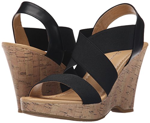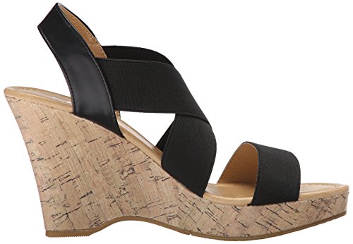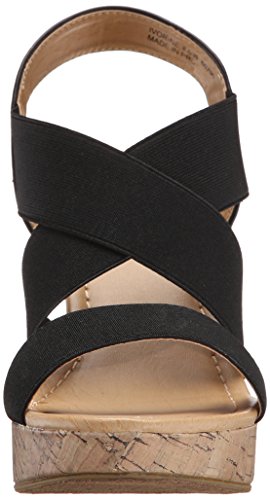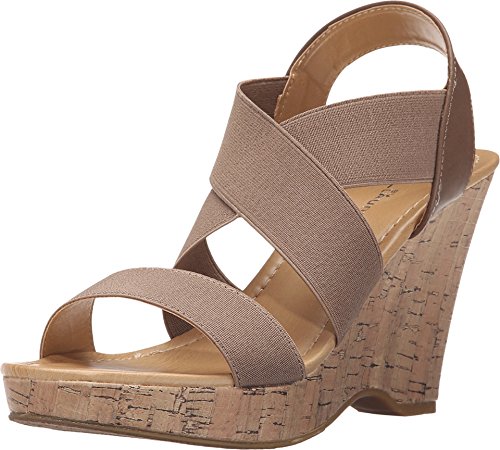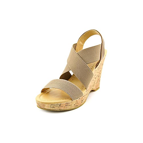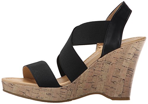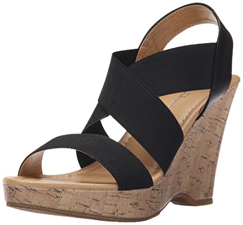 Slip-on with elastic panels. Open-toe. Synthetic lining and footbed. Textile and synthetic outsole. Cork-wedge platform and wedge heel. Imported.
