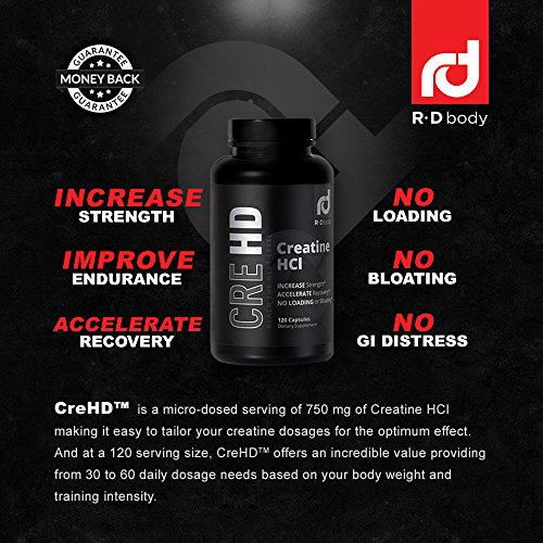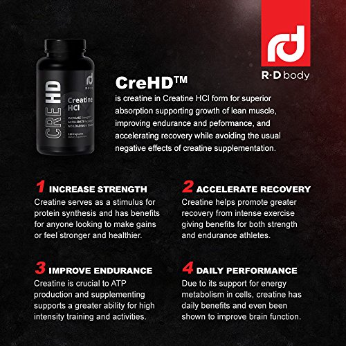 -. Binding : Health and Beauty -. Brand : R+D Body -. EAN : 0741360429550 -. Feature : SHORTER RECOVERY - Creatine is crucial for ATP production and aids in shorter recovery from exercise / NO BLOATING & GI STRESS - Creatine capsules - greater solubility and no usual creatine side effects / GREATER ENDURANCE - Best Creatine HCL that promotes greater uptake and increase lean muscle mass / CERTIFIED AND MADE IN USA - GMP Certified creatine pills that are made and bottled in the USA / 100% MONEY BACK GUARANTEE - We will provide a 100% refund if you are unsatisfied for any reason -. IsAdultProduct : 0 -. Label : R+D Body -. Manufacturer : R+D Body -. MPN : 001 -. PackageQuantity : 1 -. PartNumber : 001 -. ProductGroup : Health and Beauty -. ProductTypeName : HEALTH_PERSONAL_CARE -. Publisher : R+D Body -. Size : 120 Capsules -. Studio : R+D Body -. Title : Creatine HCL Capsules - 120 Creatine Pills for Muscle Size and Strength - CreHD by R+D Body - Vegetable Capsules -. UPC : 741360429550