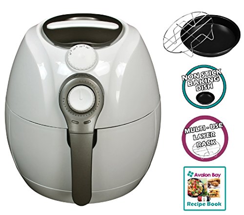 Avalon Bay air fryer with rapid air circulation technology. Includes recipe book and 2 piece baking set. When you add the Avalon Bay ab-airfryer100b air fryer to your kitchen, you are in fact adding one of the most innovative, useful, deluxe and healthy appliances ever created. An air fryer provides several cooking and reheating options all in one compact multi-fryer. You can still indulge in your favorite foods while also leading a healthy lifestyle. Avalon Bay is simply giving you the opportunity to fry, bake, grill or roast your food, but in a healthier way. Features: 3.2 liter oil-less air fryer includes 2 piece baking set and cookbook 30 minute timer non-slip feet removable basket for easy transfer of food temperature up to 400 degrees 1400 watts/120 volts. Don’t deep fry your food, air fry your food in this healthy mini convection oven. Air fryers work the same way as convection ovens, but better. The Avalon Bay air fryer collection has improved the way we do our cooking and has many great features. Some of the better and improved features of the air fryer collection are: The powerful XL fan technology inside the unit removes the fats & oils from the food, by allowing it to drip through the drip basket it then airfrys the food by lifting the oil through convection and coating the food. It does this continuously throughout the cooking process. This guarantees food is crispy on the outside and tender on the inside. A reliable and healthy alternative to deep frying.Feature