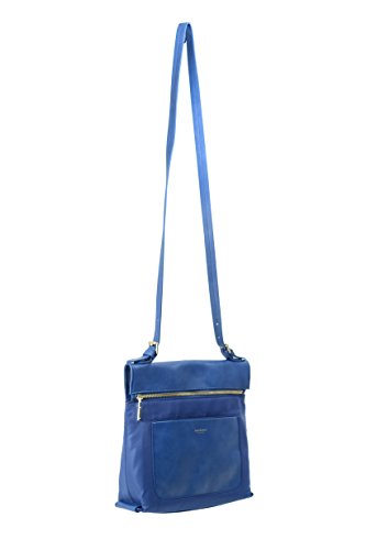 Exterior front slip pocket, back snap pocket, and adjustable crossbody strap.