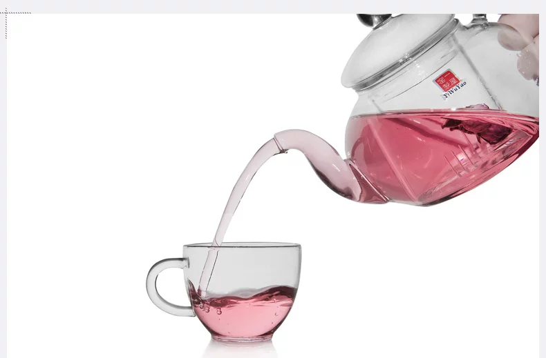 将泡好的茶水倒入杯中,注意不要倒得太快太急,以免溅落茶汤。 | 600ML的玻璃壶,可以保证几人同时喝茶的量。 |