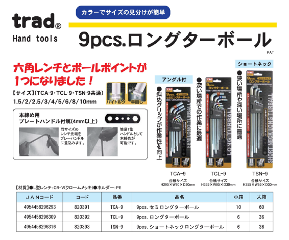【商品名】 (業務用10セット)TRAD ロングターボール(六角レンチ/作業工具) 9個入 TCL-9 〔業務用/DIY用品/日曜大工/スパナ〕 【ジャンル・特徴】 六角レンチ/ボールポイントが一つに!深い場所に最適工具セット ■サイズ・色違い・関連商品■ロングターボール 2セット■ロングターボール 10セット[当ページ]■セミロングターボール 3セット■セミロングターボール 20セット ■商品内容 【ご注意事項】・この商品は下記内容×10セットでお届けします。6角レンチとボールポイントが1つになりました!カラーでサイズの見分けが簡単!ハイトルク、早回し!狭い場所での作業に最適。本締め用プレートハンドル付属(4mm以上)…同サイズのレンチ先端をプレーハンドルに差し込みます。 簡易T型ハンドルとして本締めが可能です。サイズ:1.5/2/2.5/3/4/5/6/8/10mm■商品スペック●台紙サイズH335XW95XD30mm●材質 L型レンチ:CR-V(クロームメッキ) / ホルダー:PE■送料・配送についての注意事項●本商品の出荷目安は【1 - 7営業日 ※土日・祝除く】となります。