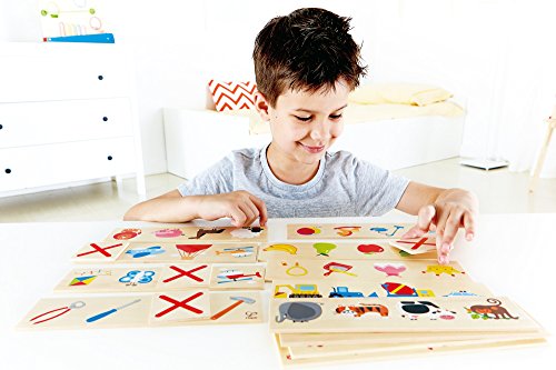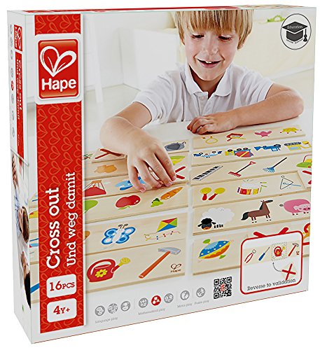 Learning is powerful and fun. The Home Education category of products from Hape helps prepare children for their formal school age years through the fun of language play, mathematical play, and motor skills. Home Education is endorsed by teachers all over the world. Kids teaching parents and parents teaching kids. For the game Cross Out, name the items that belong together and "X" out the odd item. This 16 piece game helps children with association and shapes. Durable child safe paint finish and solid wood construction are hallmarks of Hape toys. Hape's toys stimulate children through every stage of development and help nurture and develop their natural abilities. All Hape products sold in North America meet or exceed all applicable safety standards making every Hape toy an investment kids will love and parents can trust. Hape believes that the future begins---and belongs---to our children. Please see other Hape Home Education games for additional learning fun.Feature