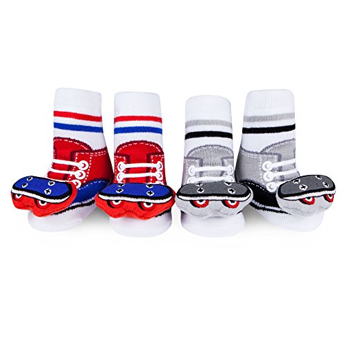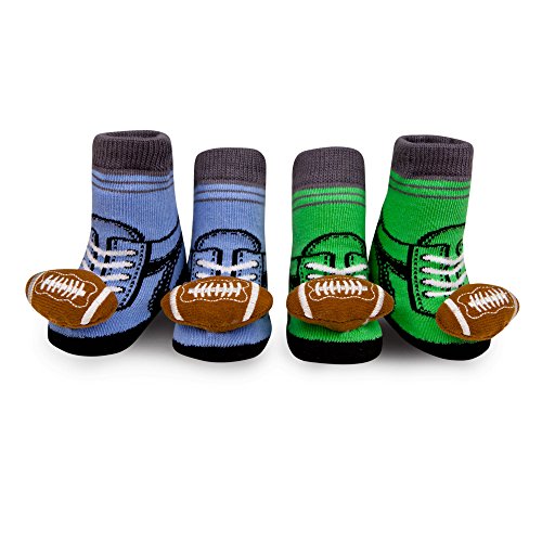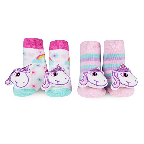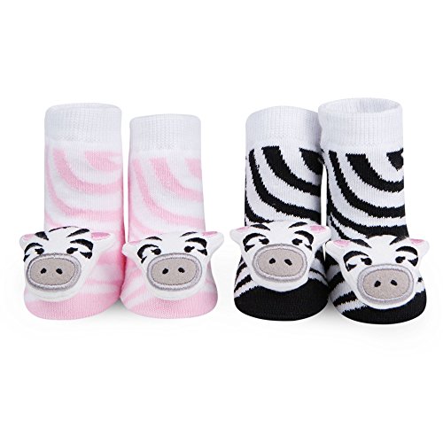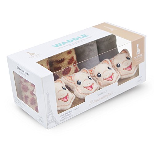 Waddle and Friends Rattle Socks: Waddle and Friends has licensed Sophie La Girafe to bring you the most loved giraffe on your socks. Waddle newborn baby socks with rattle toes are durable developmental foot finder toys. Newborn baby rattle sock baby booties are both cute and functional. Baby socks have an adorable lightweight soft plush rattle on the front to aid In developing eye hand coordination. Baby booties help keep babies entertained and encourage playful body discovery. Socks encourage baby's to reach and grab, awakening muscles. With every movement and wiggle, listen to the soft rattle. Each pair of baby crew socks have soft elastic on the top and are machine washable. Waddle and Friends is made in the same factory as many high end designer baby boutique socks. They make an very cute and affordable baby present. If you are looking for a unique baby shower present mom wouldn't have, these baby slipper socks are perfect.