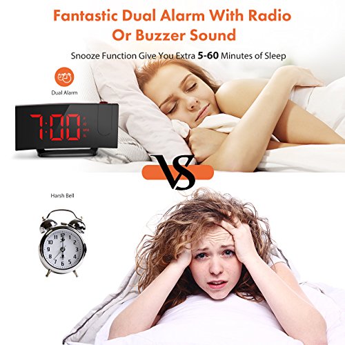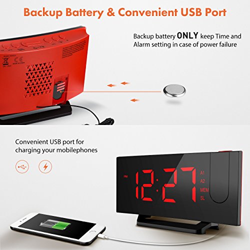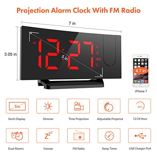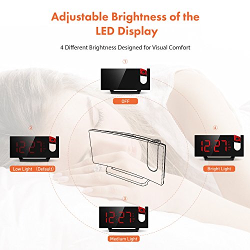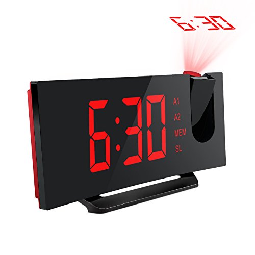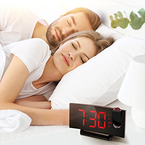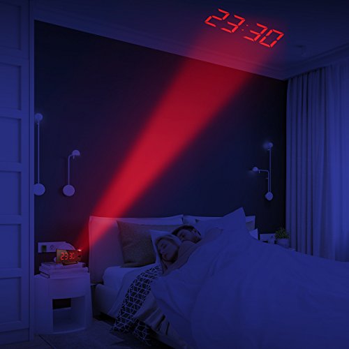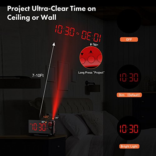 Project Time onto Walls or Ceiling. The projector on the top of the digital clock projects big and clear numbers onto walls or ceiling. It enables you easily read the time on the ceiling rather than twisting around to see the clock when you lying in bed. The blue ceiling projection light is soft and non-disturbing. The time direction can be adjusted 120° on the surface of the ceiling and the optimal projecting distance is 2-3m/80-12in.
