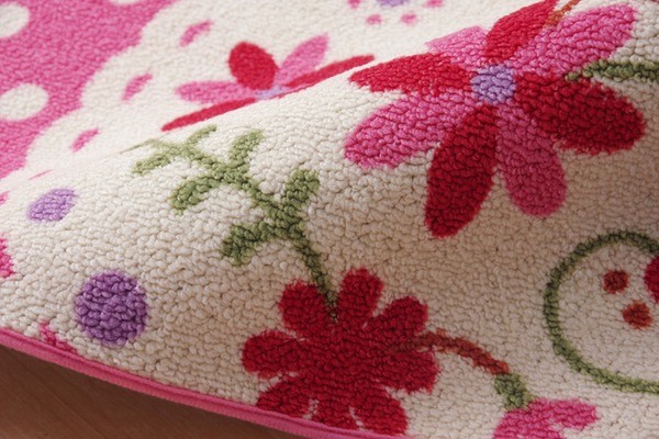 学習机用のデスクカーペットです。かわいらしい花柄が特徴です。表地はループタイプになっており、毛足が短く掃除がしやすい仕様になっています。裏地には不織布を使用していますので、フローリングが傷つきにくいです。お子様の学習机の下や、ベッドサイドなどにお勧めの商品です。
