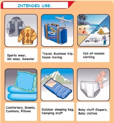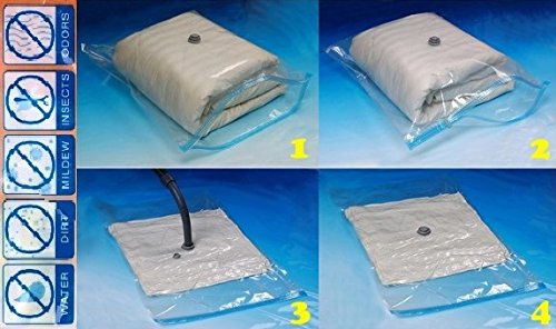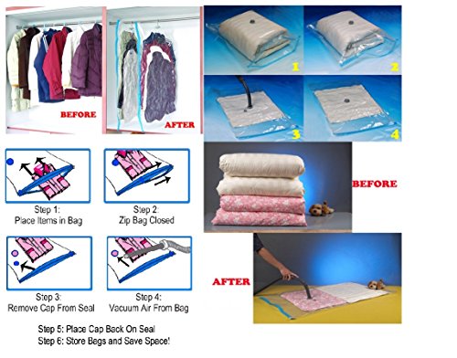- Feature : 13 bags total : This listing includes 12 total packs of the extra secure double lock valve system Vacuum seal Space Saving compress storage bags in Large Size 28''x20'' + 1 quart size carry on multipurpose TSA Travel bag (size 8''x6''x1.5''). The newest 2015 improved design on the zipper seal, valve and material flexibility for durability and user friendly. / Versatile usage on: shirts, pants, under garments, beddings, bulk items, blankets, throws, cushions, curtains, fabrics, etc. and great for all ranges of storing capabilities include: Wardrobes, Attics, Suitcase, Cupboard, store under the bed, hiking, backpacking, camping, traveling, home moving, storage room, anywhere you can think of to save space! / Extremely useful on seasonal changes and saves a ton of space! Reduce your wardrobe by up to 3x -5x times and store them away for next season! You can feel ensured and relaxed, knowing our storage bags provide great protection against: Dirt, Dust, Bugs, Mildew, Odors, Insects, Mold, Moisture and liquid. / Each vacuum storage space saver bags come with a vacuum seal suction valve to draw out any unnecessary air and space while providing an airtight, secure space saving method for all needs. Complete reusable so you can reuse it over and over again. / To ensure fast and quick delivery, we shipped all orders out within 1 business day via USPS Priority (1-3 days) along with tracking numbers. Save on space, save on time!