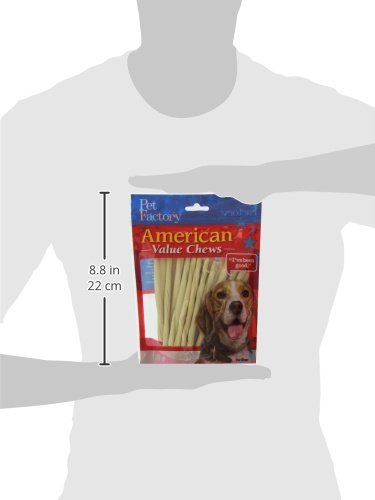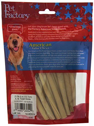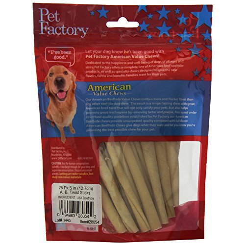 -. Binding : Misc. -. Brand : Pet Factory -. Feature : 25 pack / Satisfies your dog's urge to chew / Made from farm cattle in the US / American beef hide twist sticks dog treat -. Label : Pet Factory -. Manufacturer : Pet Factory -. Model : 28054 -. PackageQuantity : 1 -. ProductGroup : Pet Products -. ProductTypeName : PET_SUPPLIES -. Publisher : Pet Factory -. Studio : Pet Factory -. Title : PET FACTORY 28054 American Beef-Hide Premium Twist Sticks, 5-Inch, 25-Pack