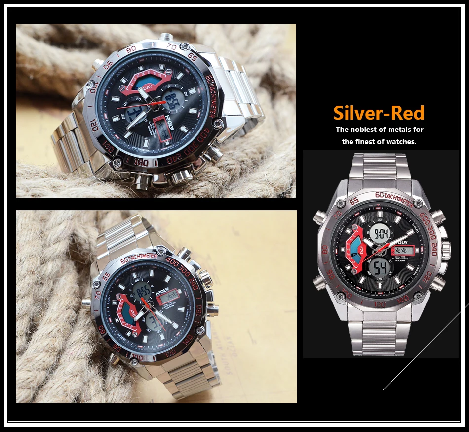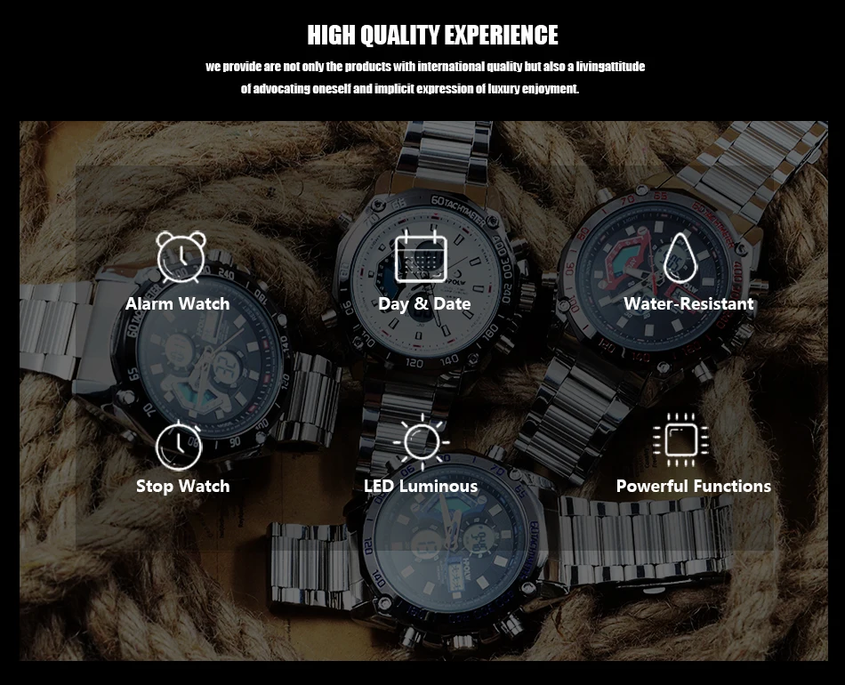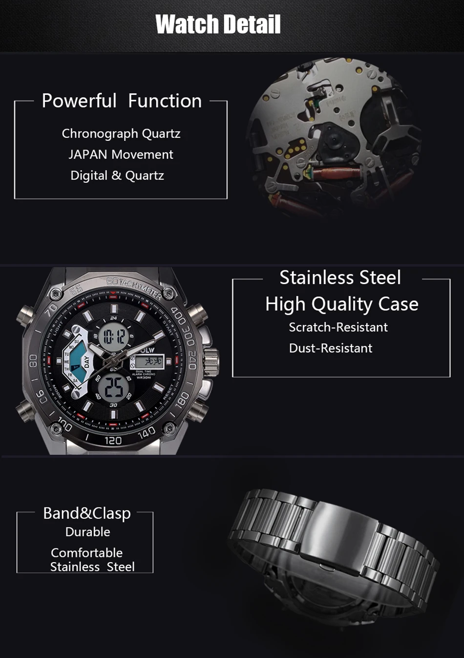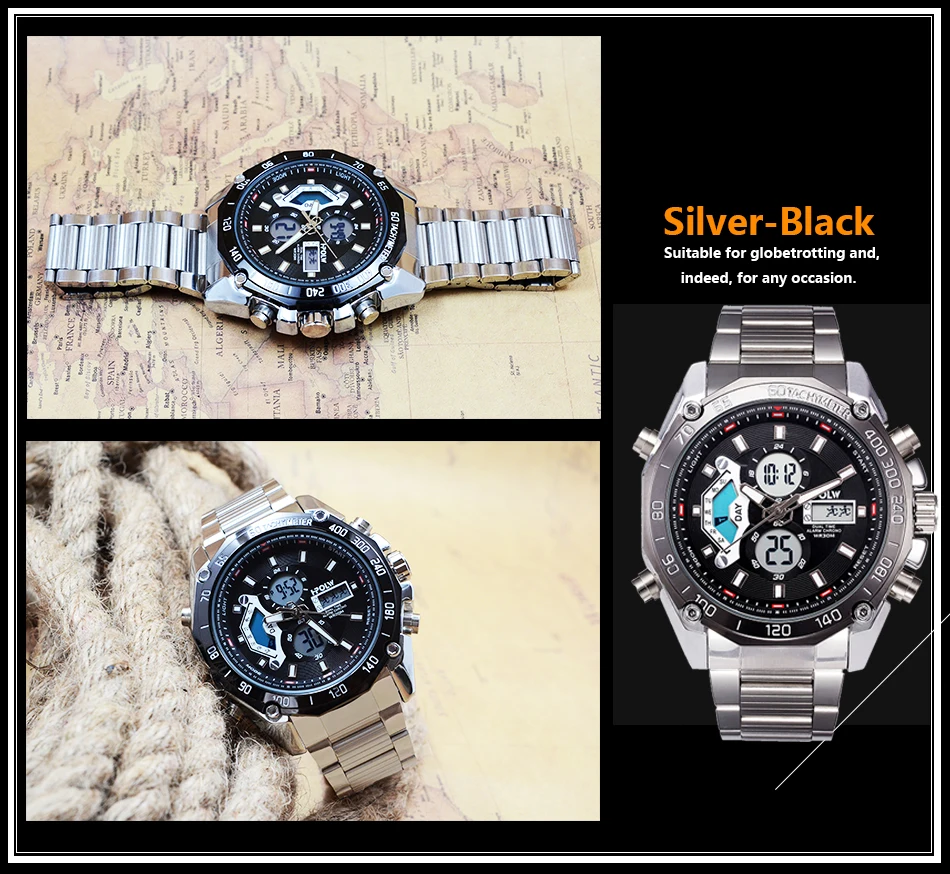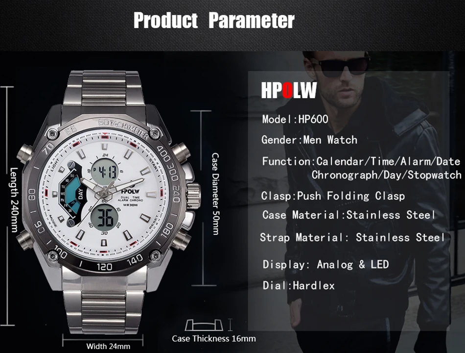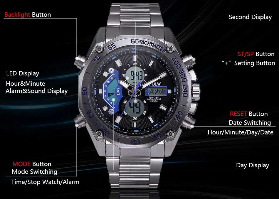 Feature:Water Resistant,LED display,Multiple Time Zone,Auto Date,Complete Calendar,Anti-magnetic,Shock Resistant,Alarm,Chronograph