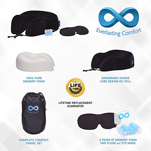 Everlasting Comfort 100% Pure Memory Foam Neck Pillow Airplane Travel Kit With Ultra Plush Velour Cover, Sleep Mask and Earplugs