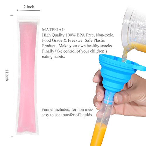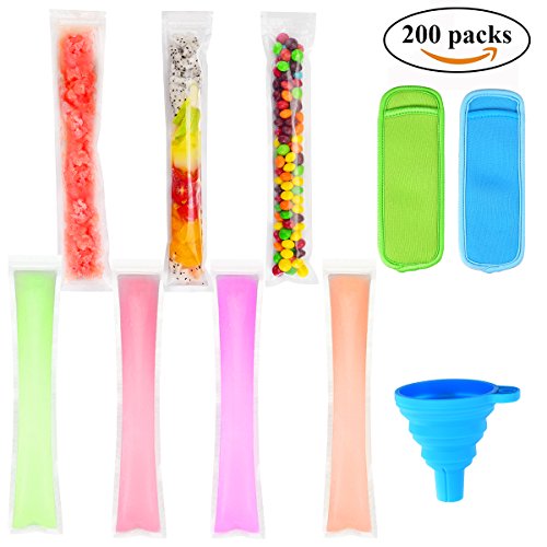 - VALUED PACKAGES: 200 pieces ice popsicle molds bags( enough to share DIY with family and friends), a Foldable Funnel (easy to use transfer of liquids) and 2 Insulator Sleeves as anti-freezing insulator sleeves to keep hands comfortable and clean. Meet your every needs.