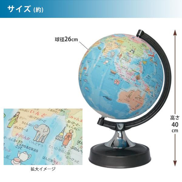 | 国や地域別に色分けされ、各地域にゆかりのある楽しいイラストが約100点描かれた地球儀です。26cm球にポリスチレン製のホルダーとABS樹脂製の台座を組み合わせたモデルです。デザインにもこだわり、インテリアとしてもお薦めの一品です。 |