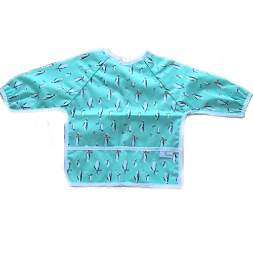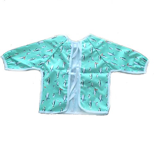 Waterproof long sleeved bib - lightweight bibs with sleeves with ties and feeding pocket, best for infant, smock, toddler, baby 6-30 months girl and boy (Penguin)
