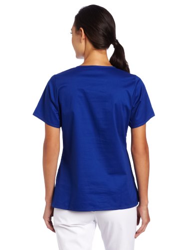 - Short-sleeve scrubs top featuring surplice neckline and front patch pockets