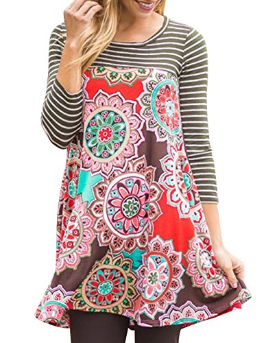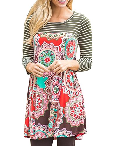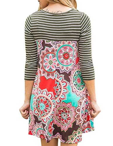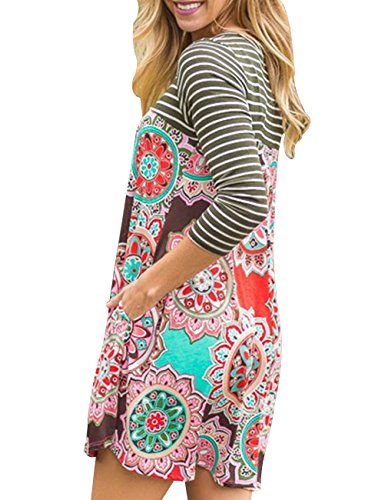 Miskely Women's Floral Print 3/4 Striped Sleeve Tunic Dress Casual Midi Shirt Swing Dress With Pockets