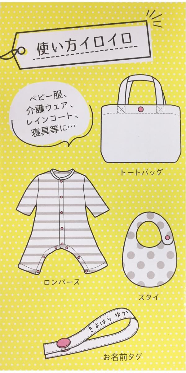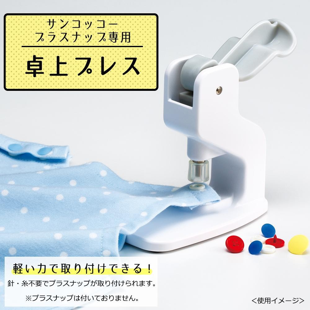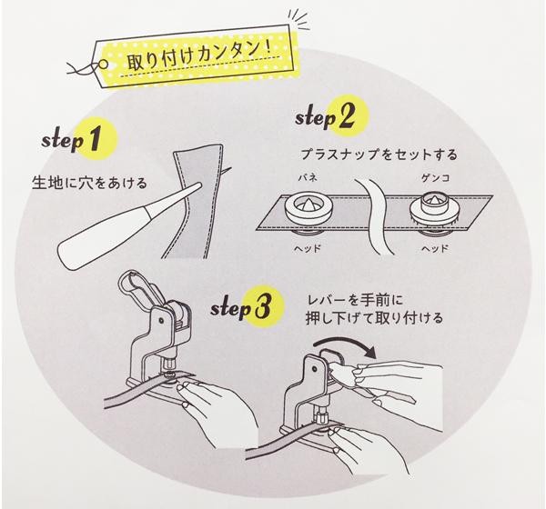 | 針・糸不要でプラスナップが簡単に取り付けられます。付属の台座を取り替えると、2サイズ(9mm、13mm)のプラスナップとプラスナップボタンが取り付けられます。 |