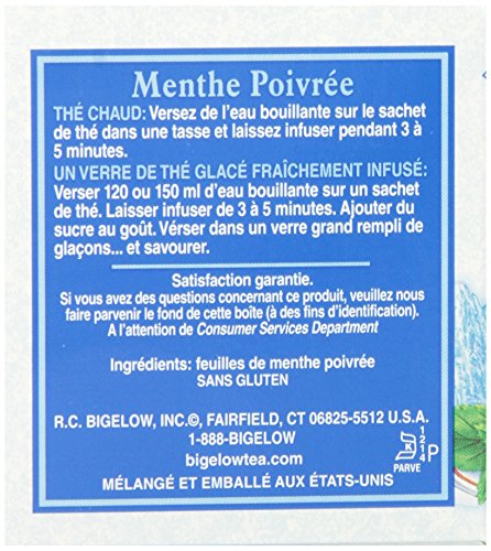 -. Binding : Grocery -. Brand : Bigelow Tea -. EAN : 0072310010390 -. Feature : Pack of six 20-count boxes of calorie-free herbal tea (120 total tea bags) / Fine herbal tea made from peppermint leaves / Caffeine-free and gluten-free, with no calories and no carbohydrates; Kosher Parve, 100% natural / This soothing herb tea relaxes and refreshes with all-natural flavors / Ships in Certified Frustration-Free Packaging -. IsAdultProduct : 0 -. Label : Bigelow -. LegalDisclaimer : Actual product packaging and materials may contain more and different information than what is shown on our website. We recommend that you do not rely solely on the information presented and that you always read labels, warnings, and directions before using or consuming a product. -. Manufacturer : Bigelow -. MPN : 1039 -. NumberOfItems : 6 -. PackageQuantity : 6 -. PartNumber : 1039 -. ProductGroup : Grocery -. ProductTypeName : GROCERY -. PublicationDate : 2010-10-13 -. Publisher : Bigelow -. ReleaseDate : 2006-06-22 -. Size : 6 Pack -. Studio : Bigelow -. Title : Bigelow Peppermint Herbal Tea, 20-Count Boxes (Pack of 6) -. UPC : 072310000391