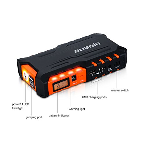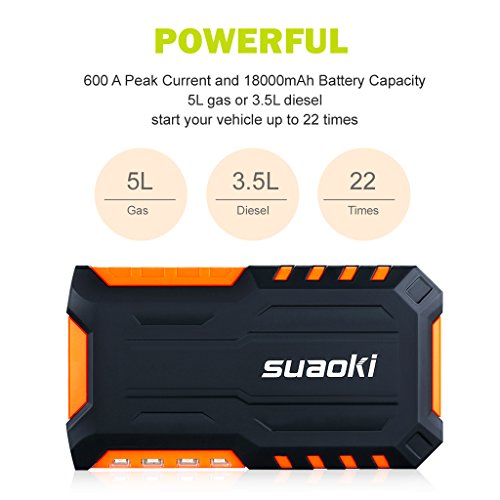 High Battery Capacity: Suaoki Car Jump Starter offers 18000 mAh huge battery capacity. So you can start your vehicle about 22 times on one charging (up to 5L gas or 3.5L diesel engine).