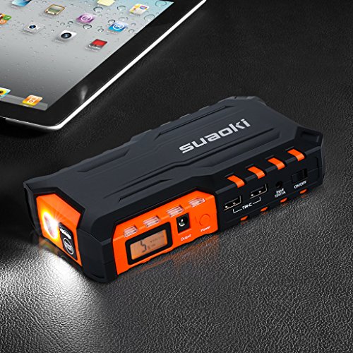 4-in-One Solution Case: Jump starter, power bank and emergency light source, and mini air compressor pump in one case. Suaoki vehicle Jump Starter embodies three functions in one device. Charging your digital devices at speed up to 2.1 amps per port via USB port or 12V/16V/19V socket. 4 modes of switchable built-in LED flashlight. At the same time, the air compressor fully inflates car tires quickly and a lightweight, portable design makes it easy to use at home or store in your vehicle.